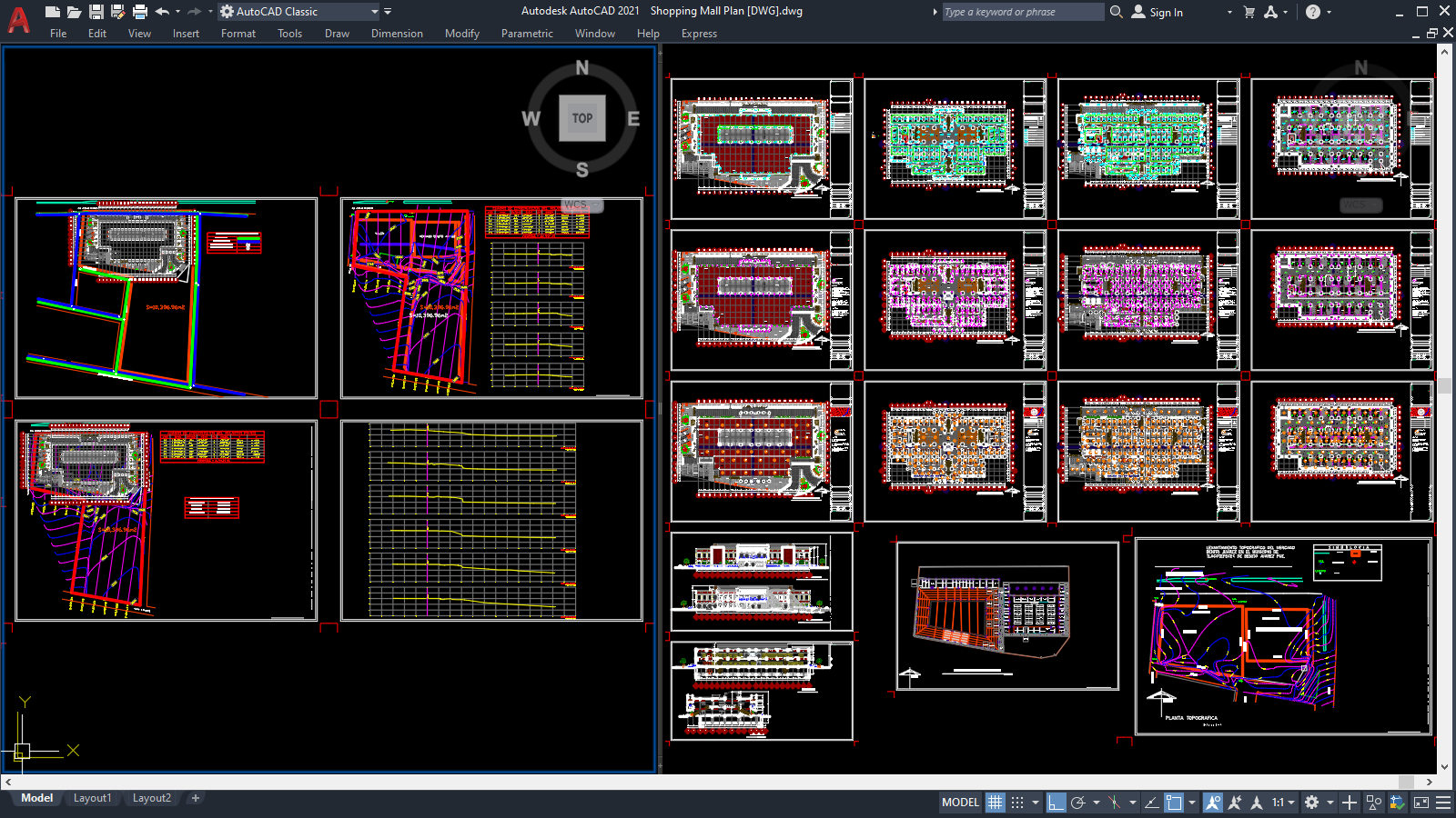 shopping mall project cad drawing, full detailed with floors and sections. this project contains a food court, atriums, and other cool components. masonry plans; architectural; details; assembly drawing; topographical