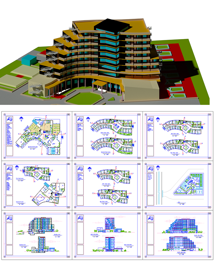 This 7 Storey hotel includes : site plan , floor plans , furniture , sections ,elevations and 3d dwg file .