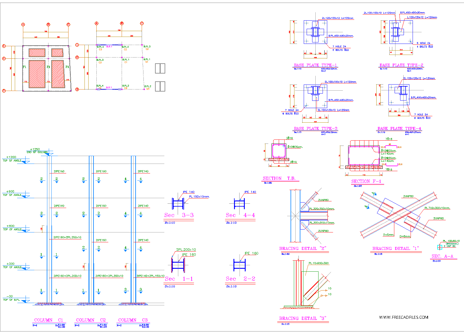 Estimated dimensions of the floor plans: 8 m * 8.1 m, Details of the steel structure of 3 story house, including Baseline plan, column plan, beam plan, model framing plan, Column details, beam details, base plate details, bracing details, CONSTANTLY CANTILEVER JOIST FROM BEAM DETAILS, JOIST-BLOCK, Drawer details, CANTILEVER TRUSS BEAM