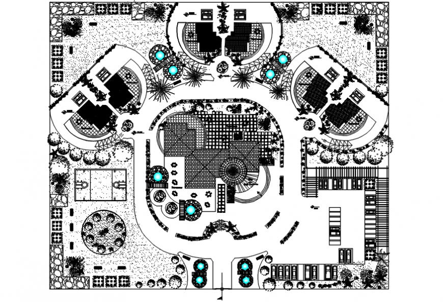 Top view of resort layout plan includes roof plan, structure detail, landscaping design, compound wall detail, also use garden blocks which is improve the presentation in AutoCAD format.